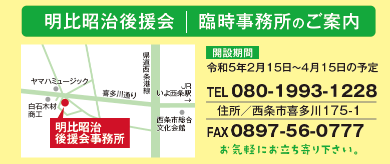 つきましては、下記の通り「後援会事務所」を設置して、更なる支援の輪を拡げたく、皆様のお力添えをお願いします。